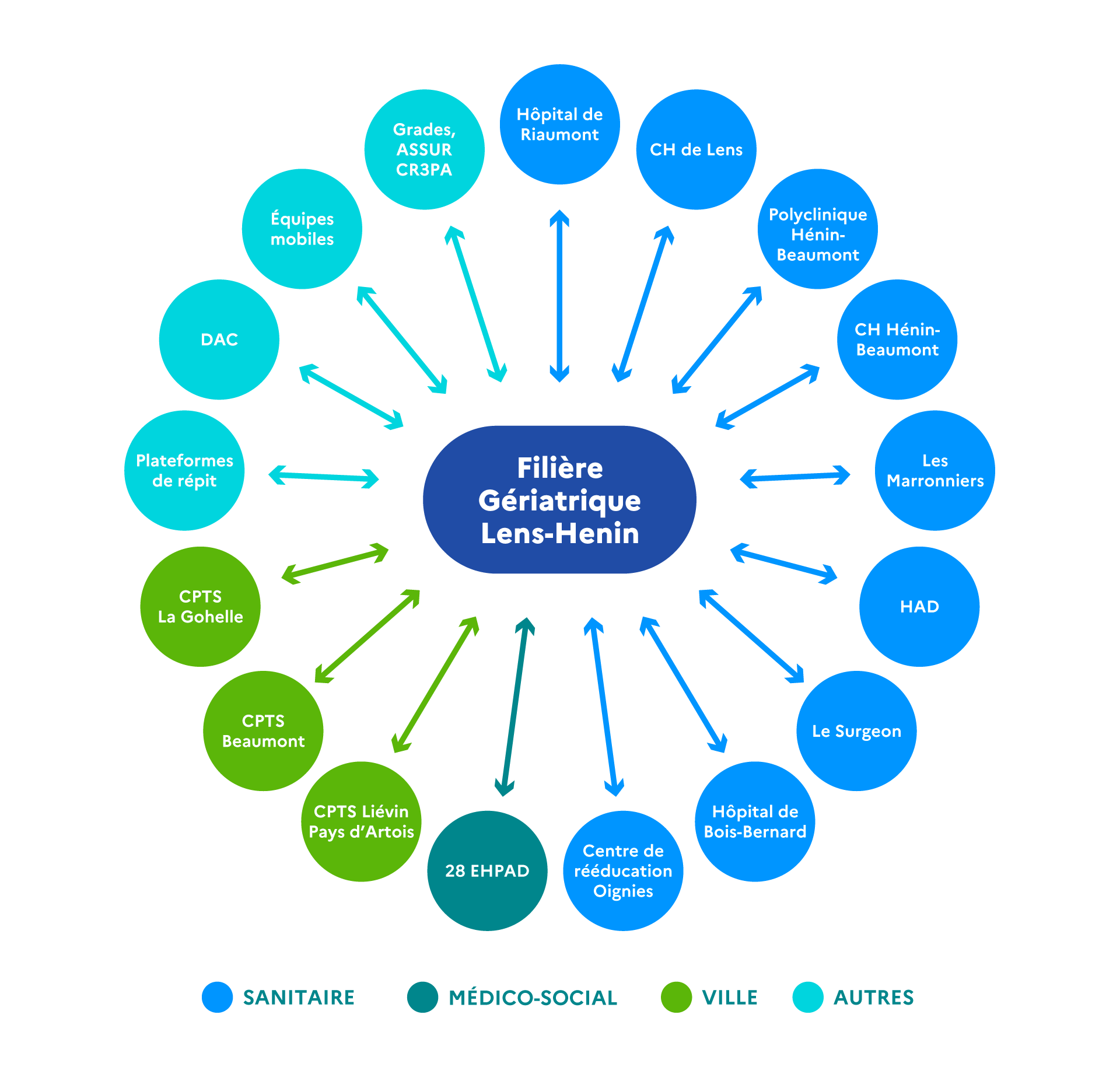La filière gériatrique réunit de nombreux partenaires aux compétences variées. Grâce à son expertise reconnue dans la gestion des situations complexes, elle joue un rôle clé dans la création de réseaux de santé dédiés aux personnes âgées. Ces réseaux regroupent, par exemple, des hôpitaux de jour, des professionnels de santé de ville et des établissements médico-sociaux. En parallèle, la filière contribue activement à la diffusion de la culture gériatrique et à la formation des équipes soignantes. Elle forme également les intervenants extérieurs à l’hôpital, renforçant ainsi la qualité des prises en charge pour les personnes âgées.
